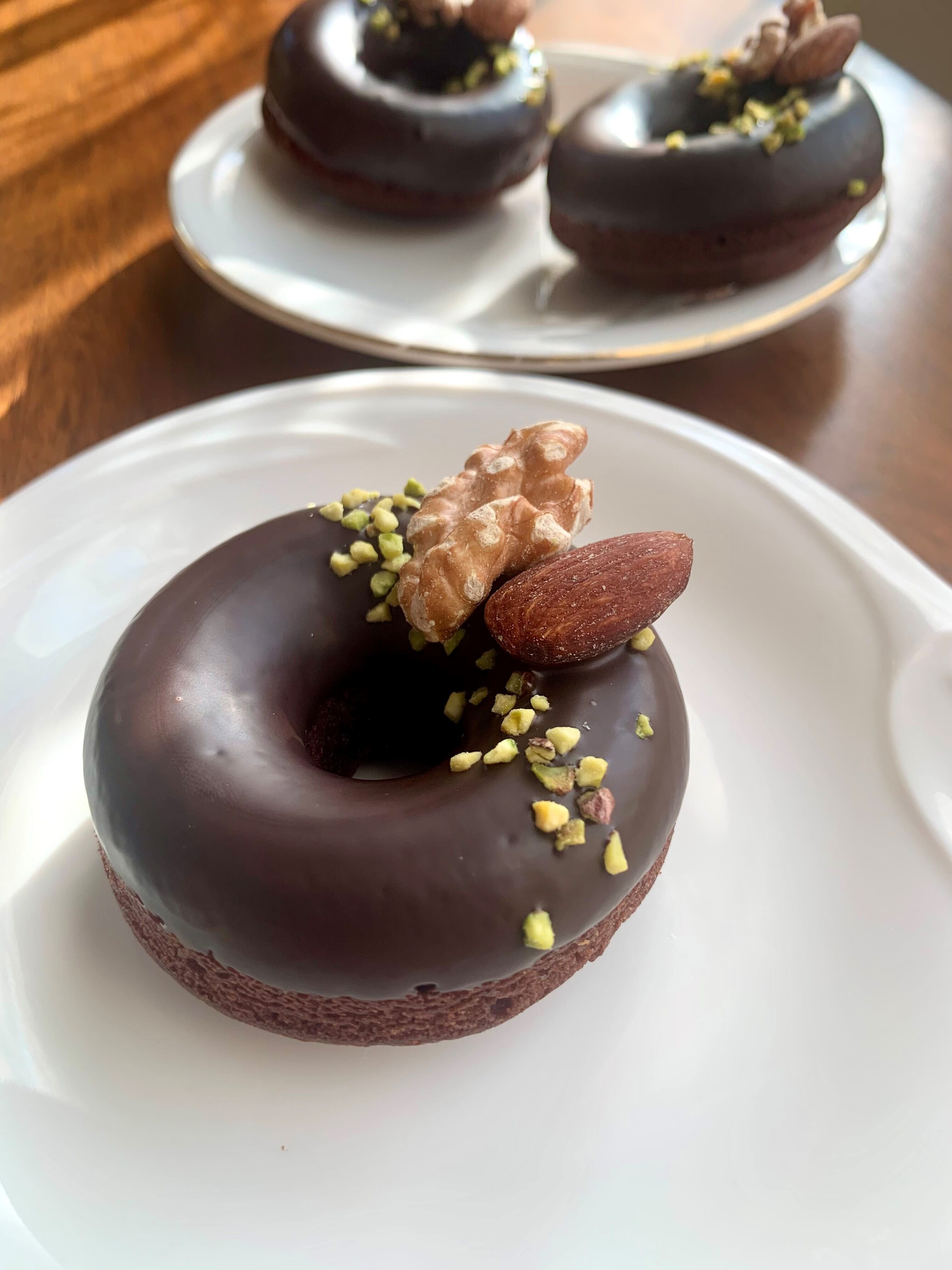チョコの甘い香りと胡桃のローストの香ばしい香りがふわっと広がるリッチな仕上がりの焼きドーナツです。