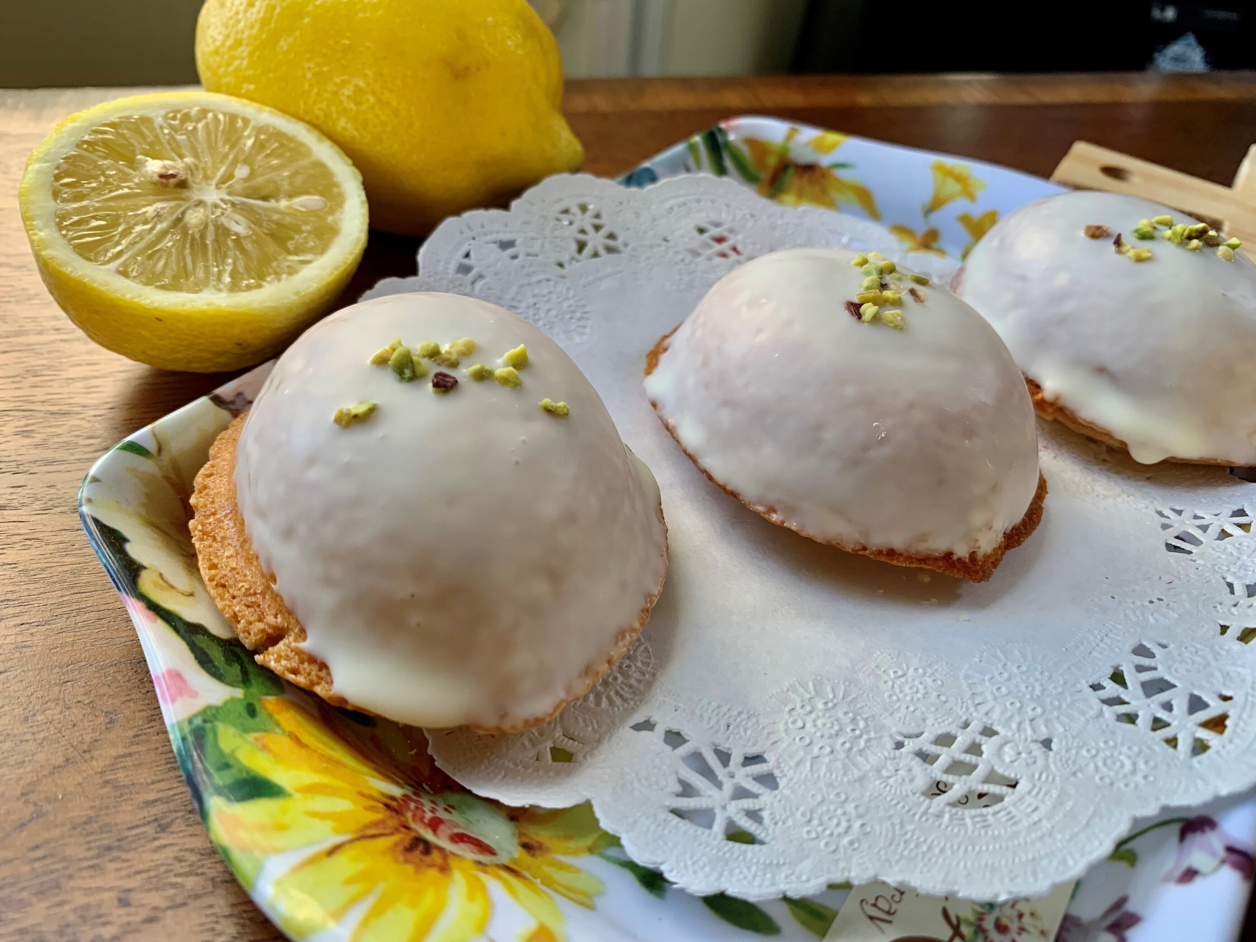 レモンの形で焼き上げ、ホワイトチョコとピスタチオで可愛く飾り付けをしました。